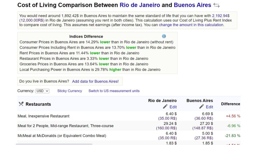 The cost of living for a foreigner in Argentina, especially with the current exchange rate. Everything is more expensive in Brazil with a 1-bedroom apartment costing around $365 in Rio de Janeiro compared to $300 in Buenos Aires. Remember Airbnbs will often cost substantially more.