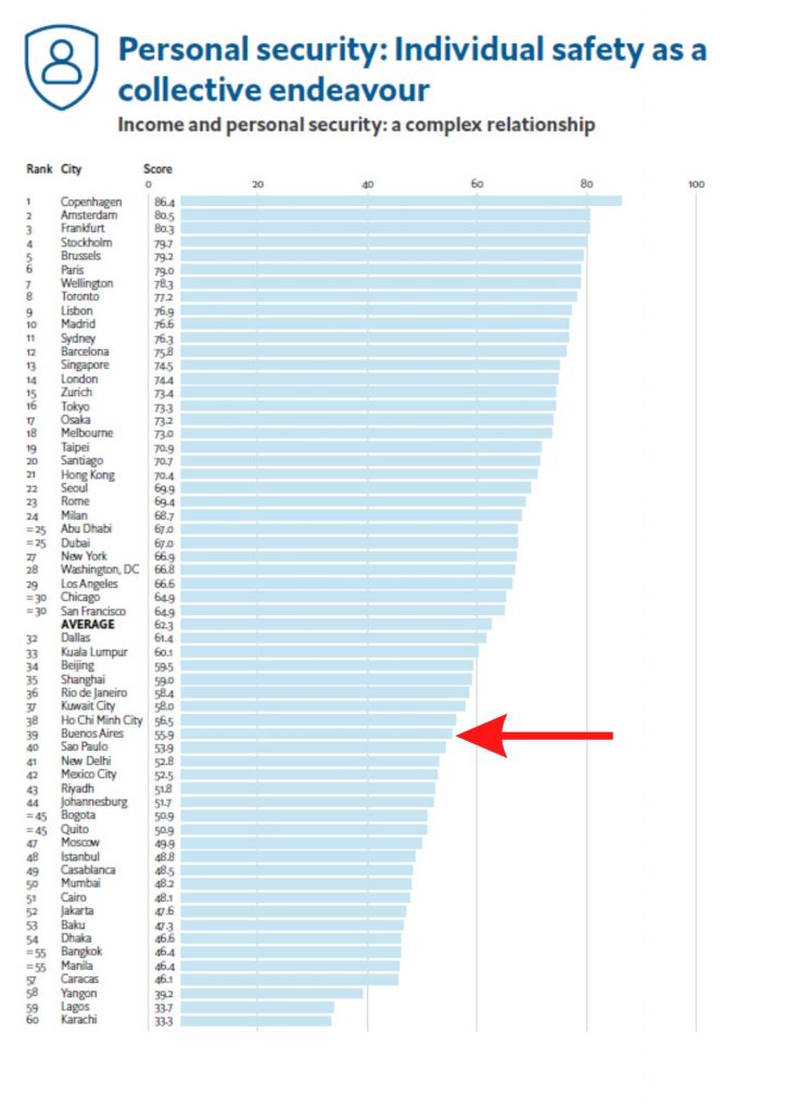 As you can see on this list below, Buenos Aires city is listed in the 39th position (average) in the category Personal Security, above cities like: Sao Paulo, Mexico City, Bogota, and Istanbul.