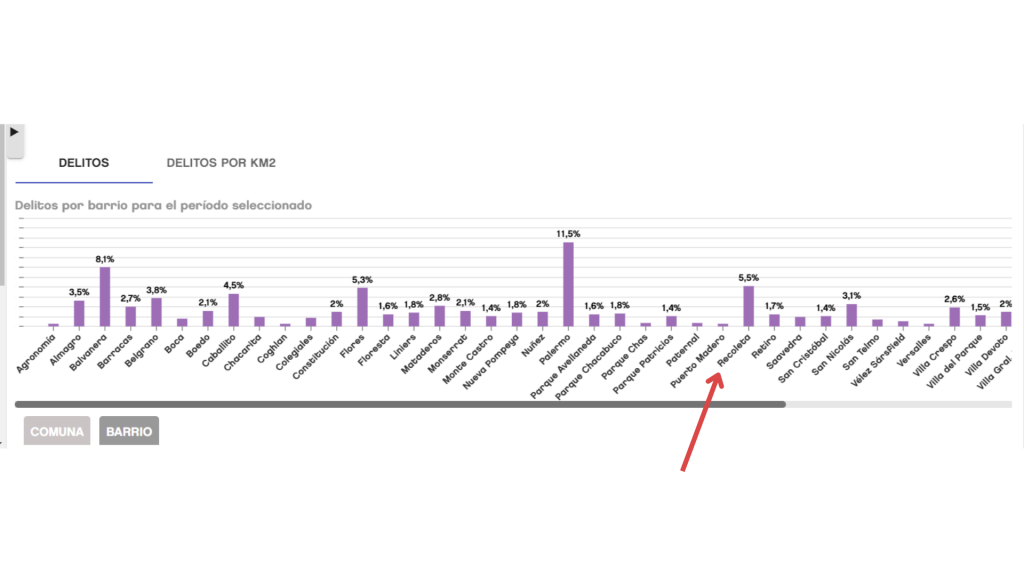 In terms of stats, Recoleta is placed last in the top 5 neighbourhoods with the most crime rate in the city. As you can see in the map below, from December 2021, Recoleta has 5.5% non violent robberies.